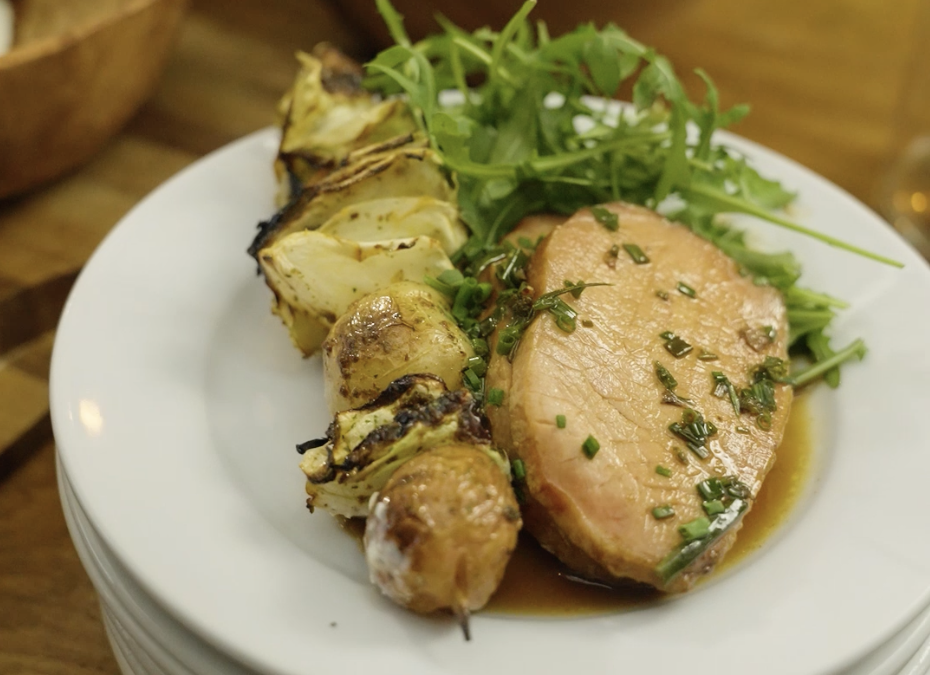 1. Cortar el lomo kassler en trozos y saltear en aceite de oliva. Adicionar romero, orégano y ciboulette fresco. Luego, agregar vino blanco, pimienta, sal y salsa de soya. Revolver bien y dejar que se cocine unos minutos.