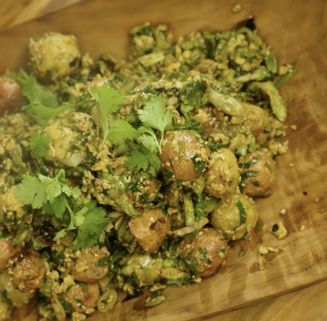 5.Agregar el cebollín completo, cilantro y las papas cocidas de la freidora de aire.