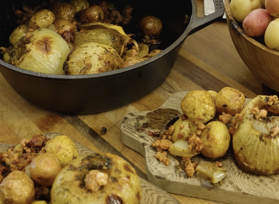 6.Desmenuzar las longanizas sin piel y rellenar el centro de las cebollas. Considerar distribuir longanizas sobre las papas.